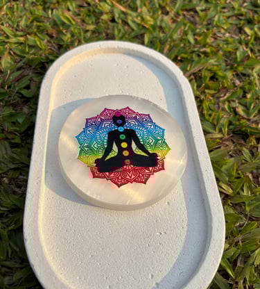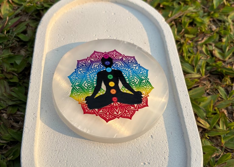 A Selenite plate with 7 Chakra engravings—a powerful tool for energy cleansing, chakra balancing, and spiritual alignment